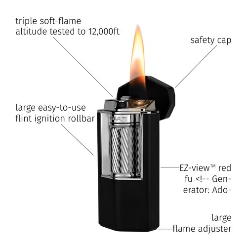 Attention to detail is never spared, from the prominent large roller bar for easy ignition to the large faceted body for a comfortable grip to our signature red EZ-View™fuel window, and easy-to-access compartment for flint replacement.